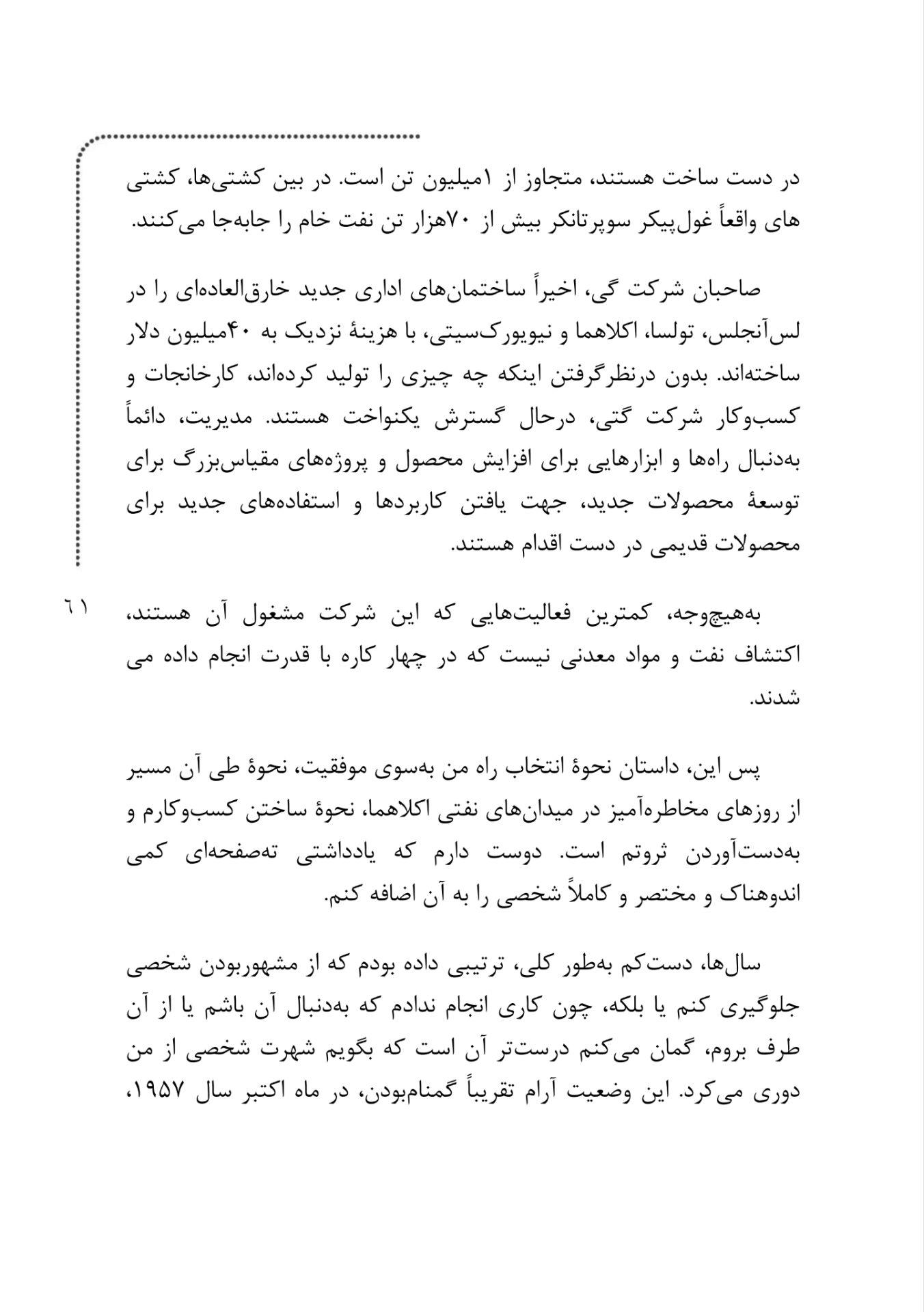 کتابهای زیادی در مورد پول درآوردن توسط مردانی وجود دارد که پول زیادی به دست نیاوردهاند. اما اگر جی. پاول گتی، که مجله فورچون او را «ثروتمندترین مرد جهان» نامیده است، نمیداند چگونه، چه کسی میداند؟ در اینجا، این تاجر میلیاردر اسرار موفقیت خود را فاش میکند - و طرحی برای کسانی که میخواهند راه او را دنبال کنند، ارائه میدهد. و او فراتر از موضوع پول درآوردن، به این سوال میپردازد که با آن چه باید کرد.