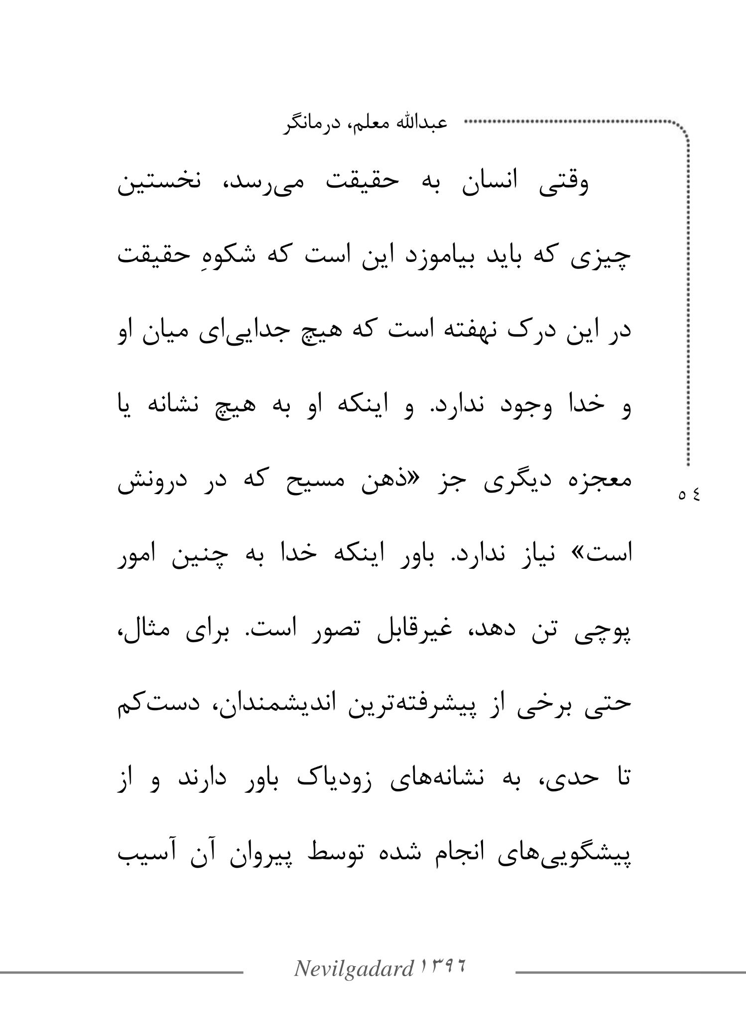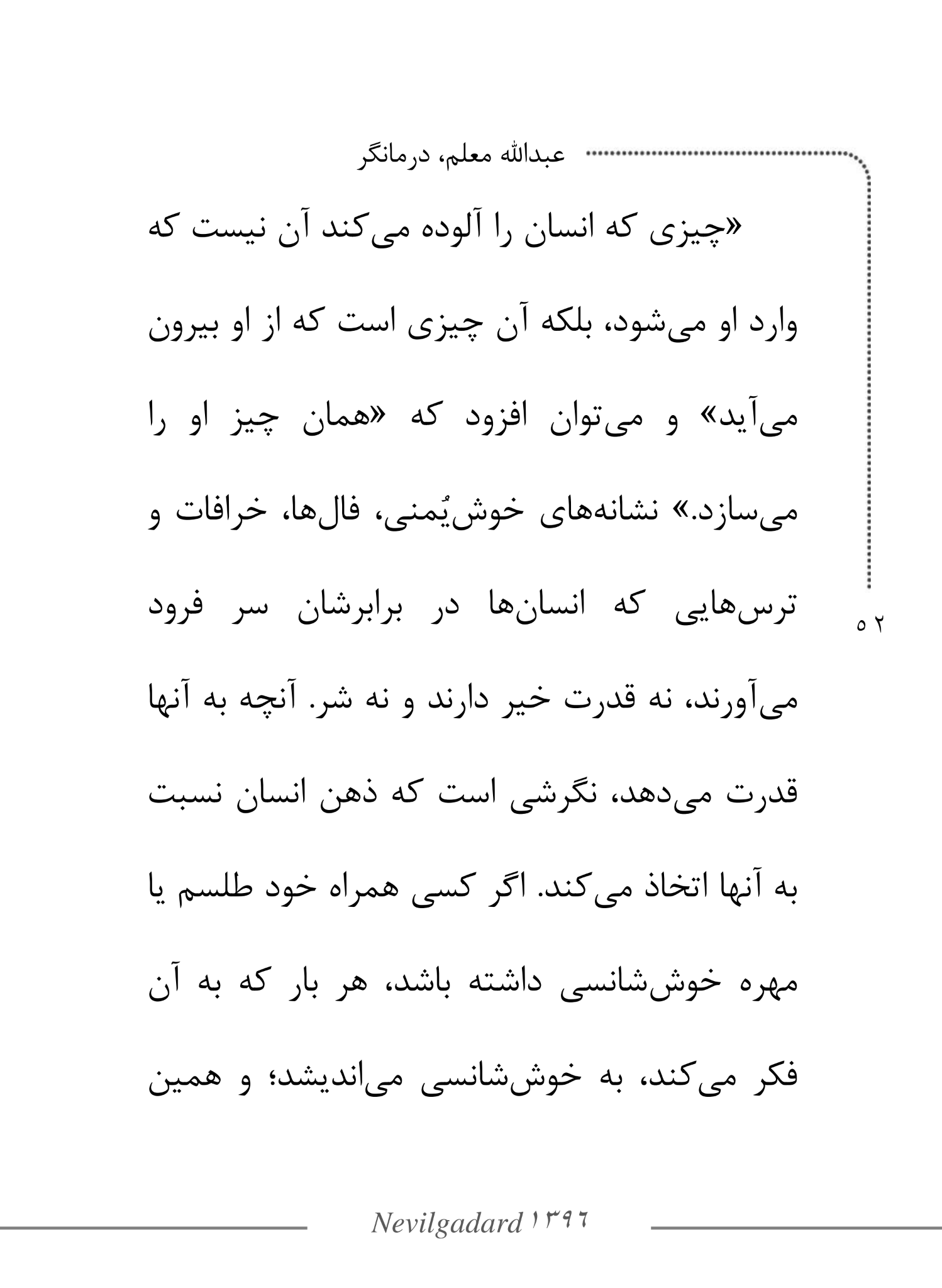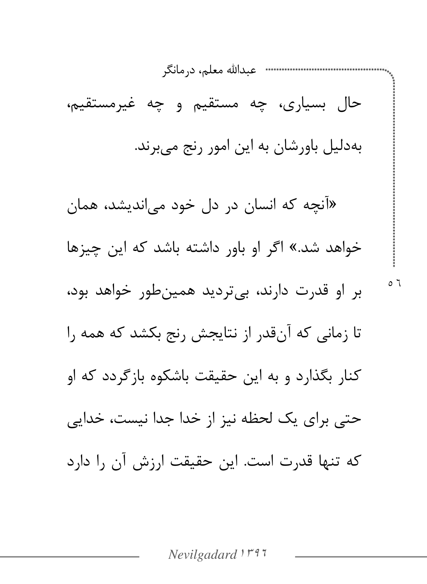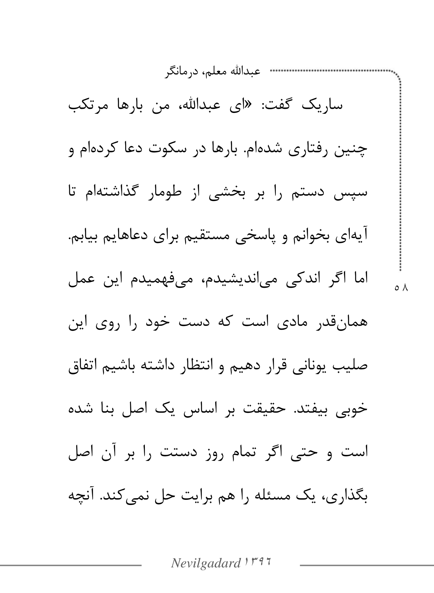 کتاب عبدالله معلم درمانگر استاد نویل گادارد یکی از آثار الهامبخش والتر سی. لانیون است؛ نویسندهای که آثارش همواره با رویکردی معنوی، روانشناختی و تحولآفرین نوشته میشود. این کتاب روایتگر جستوجوی درونی فردی است که سعی دارد ماهیت درمان، رهایی ذهن و شناخت عمیقتری از خود را پیدا کند. نویسنده با زبانی ساده اما نافذ، مسیر آگاهی و تغییر را از زاویهای متفاوت نشان میدهد.