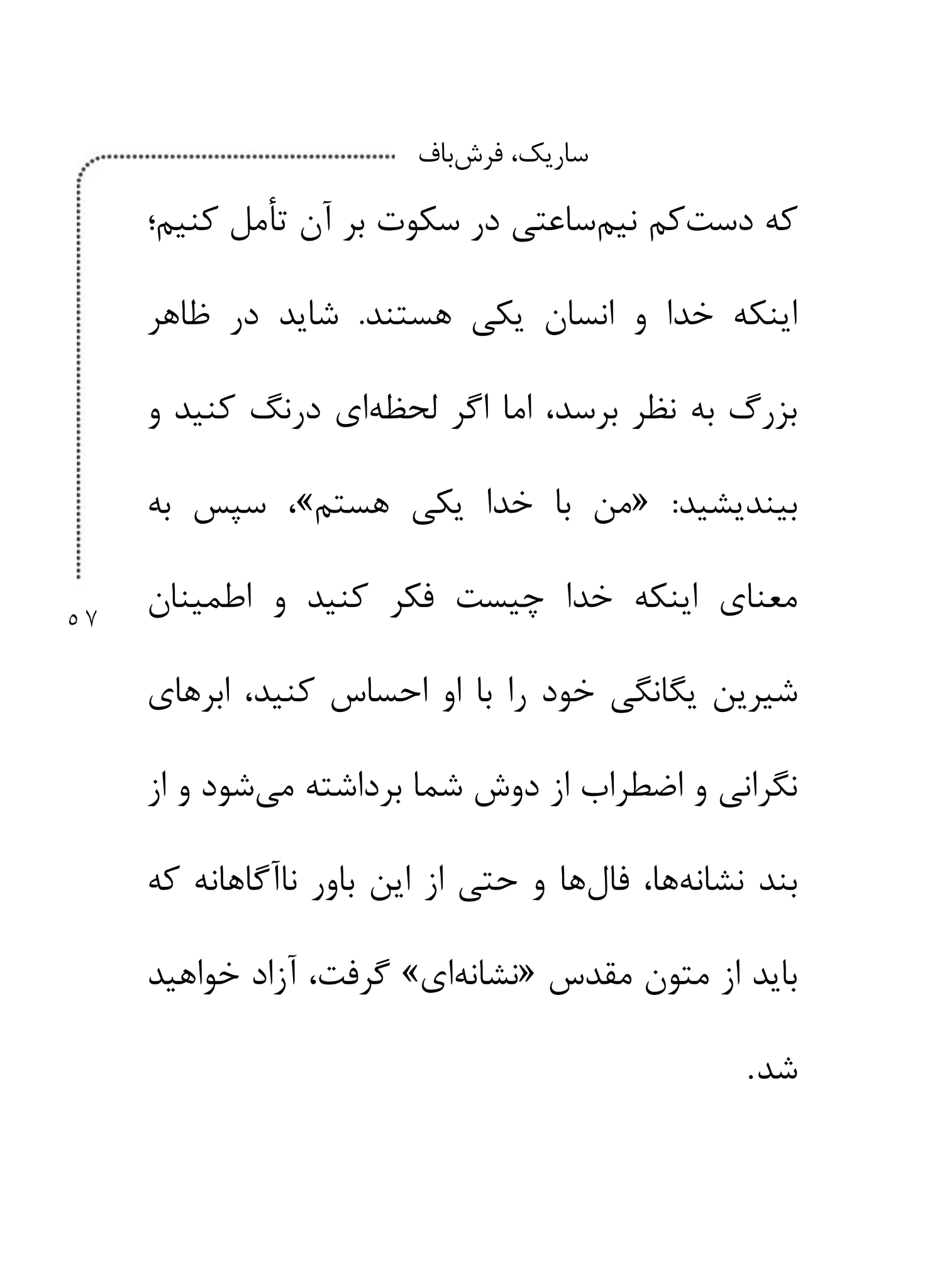 نسخه ارائهشده توسط نشر کوانتوم در قطع جیبی و با ترجمه روان مریم رشیدی تهیه شده است. چاپ با کاغذ سفید، جلد شومیز و کیفیت مناسب برای مطالعه روزمره طراحی شده تا خواننده تجربهای خوشایند داشته باشد. این کتاب ۱۶۶ صفحه دارد و گزینهای مناسب برای کسانی است که به خودشناسی، رشد فردی و مباحث معنوی علاقهمند هستند.