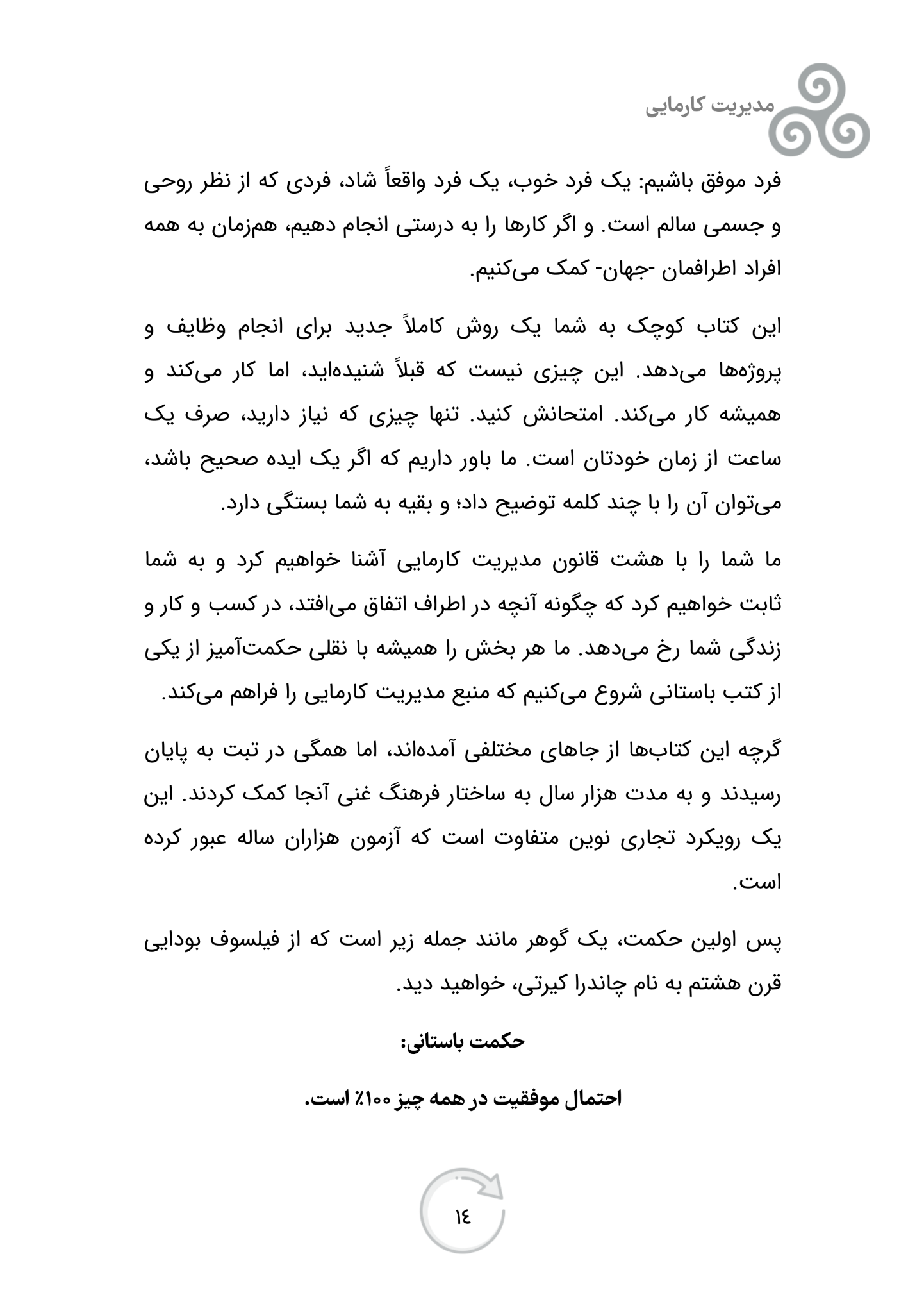 با خرید این کتاب، قدمی جدی در مسیر رشد فردی و شغلی خود بردارید و قانون کارما را به نفع خود مدیریت کنید. فرصت را از دست ندهید!