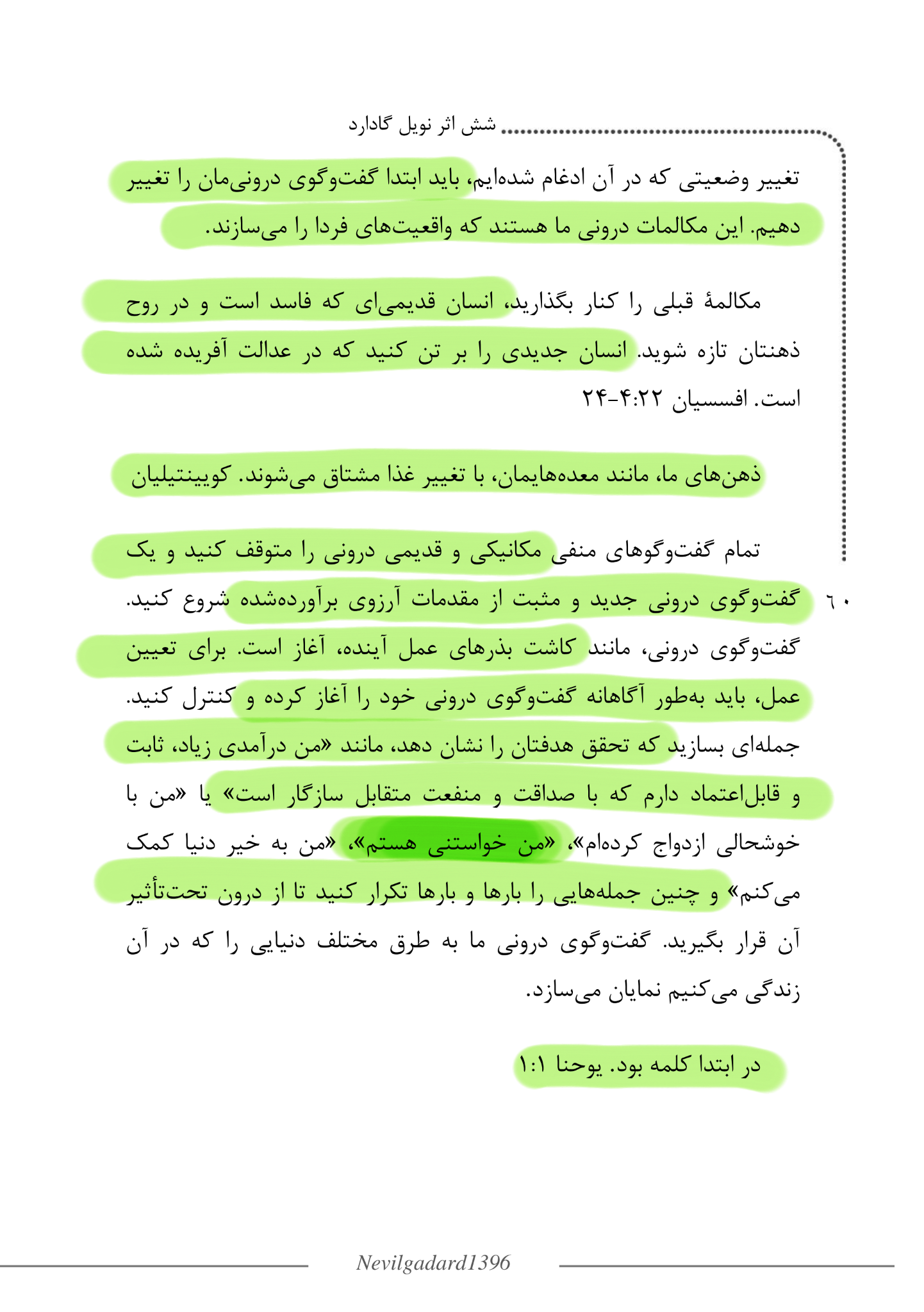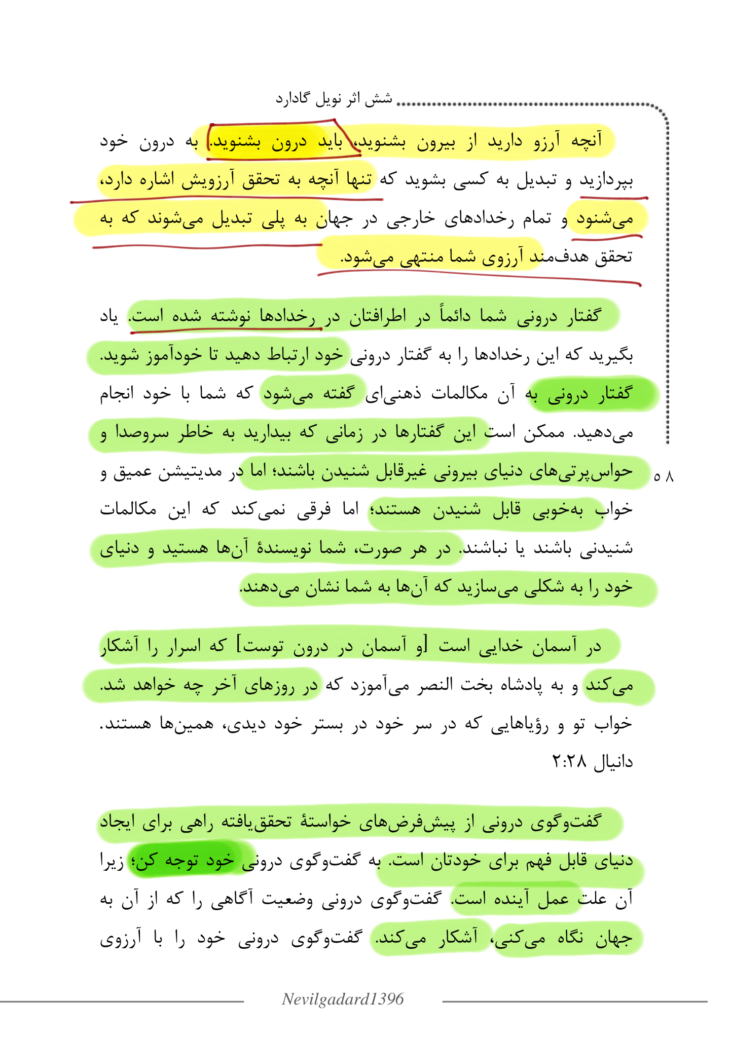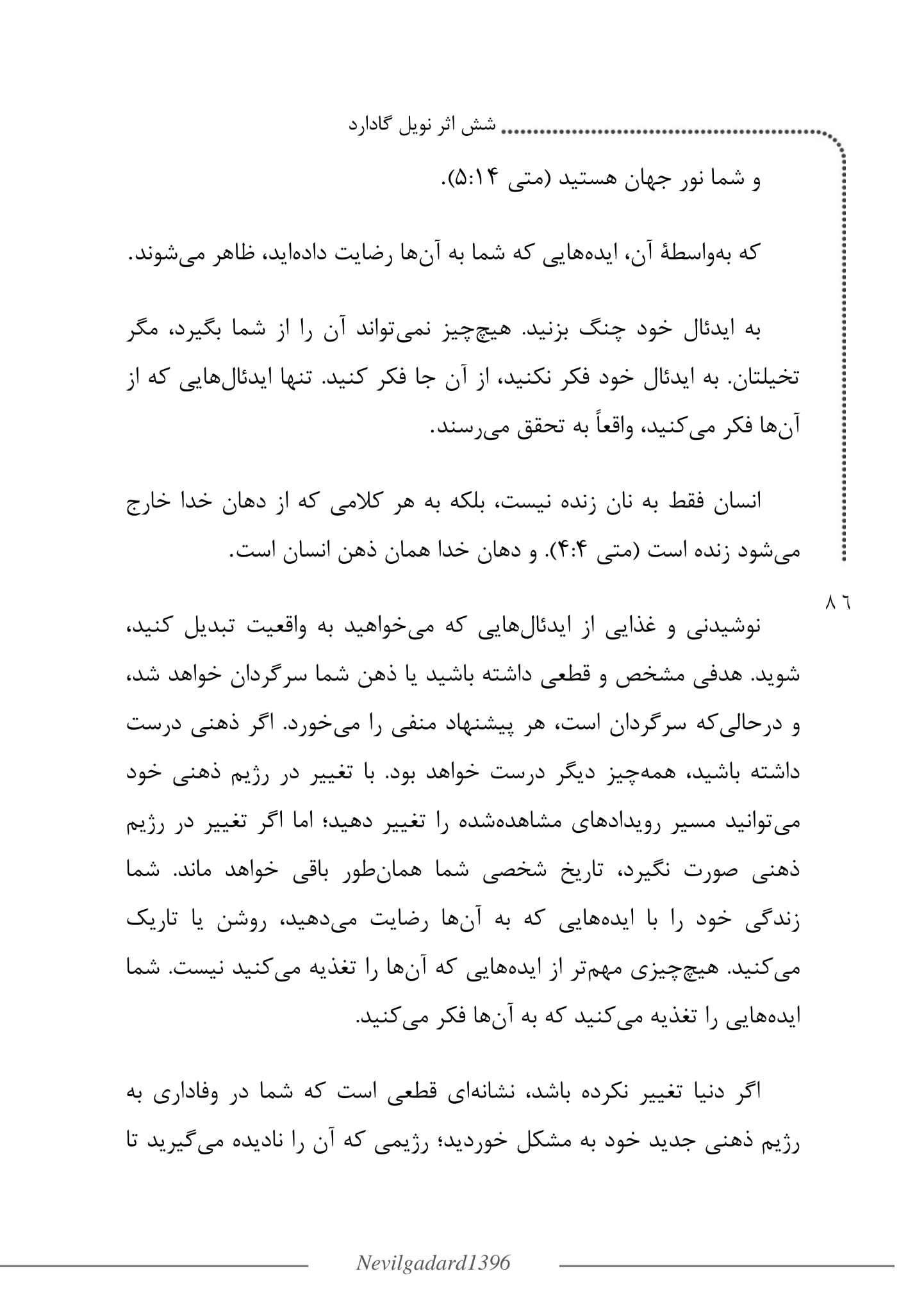 کتاب شش اثر نویل گادارد نه تنها منبعی غنی برای آشنایی با فلسفهی آفرینش ذهنی و نیروی تخیل است، بلکه راهنمایی عملی برای تجربهی زندگیای هماهنگ با خواستهها و اهداف درونیست.