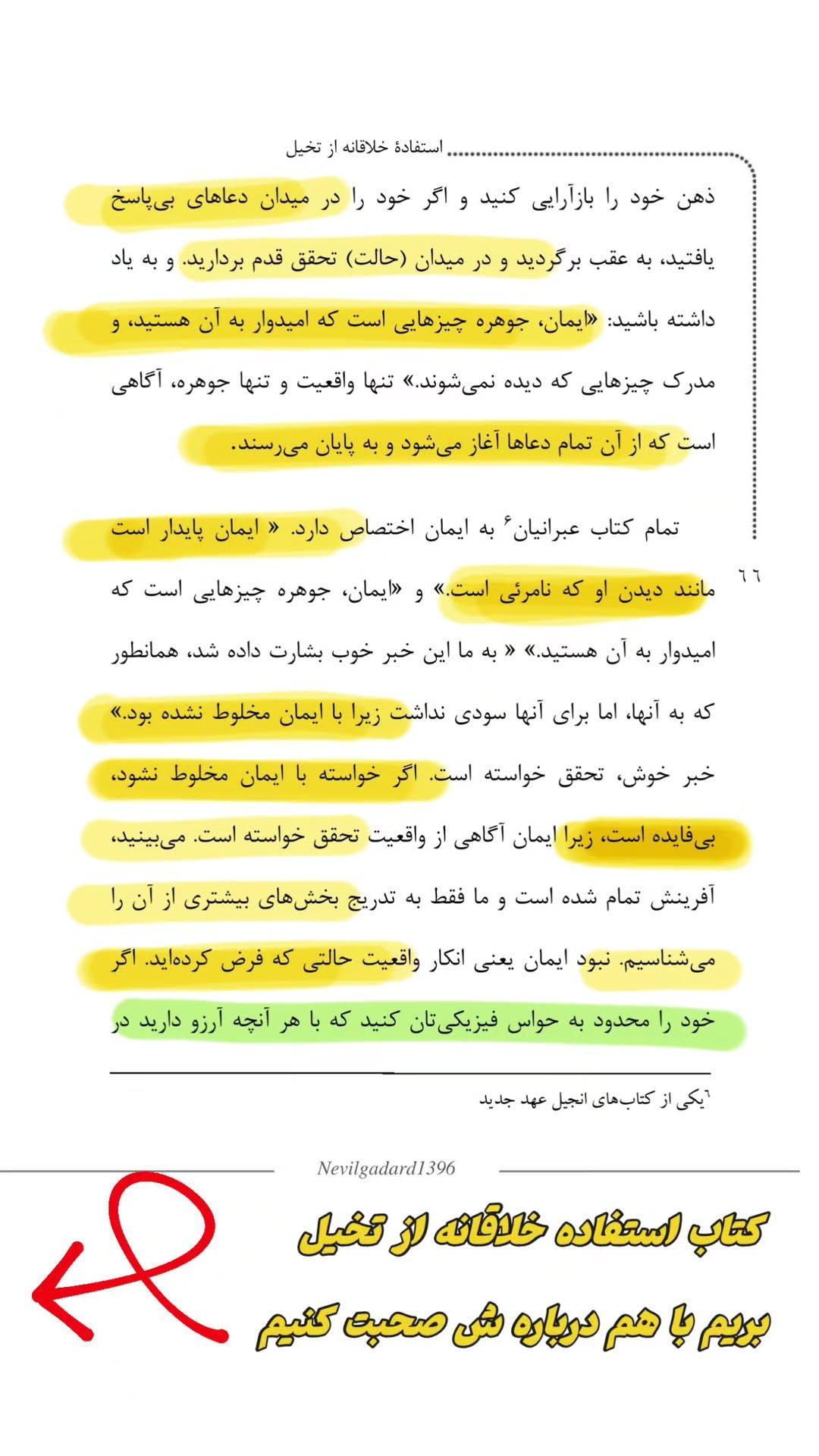 کتاب «استفاده خلاقانه از تخیل» نوشته نویل گادارد، ترجمهٔ روان مریم رشیدی و منتشرشده توسط نشر کوانتوم، راهنمایی کاربردی برای تبدیل رؤیاها به واقعیت است. گادارد در ۱۸۸ صفحهٔ خواندنی، با زبانی ساده ولی الهامبخش، نشان میدهد چگونه با تصویرسازی ذهنی و ایمان، اتفاقات دلخواه را در زندگی خلق کنیم. اگر به توسعهٔ فردی، قانون جذب یا تکنیکهای تجسم خلاق علاقه دارید، این کتاب یکی از منابع کلاسیک و پرفروش جهان است که باید در کتابخانهتان باشد.