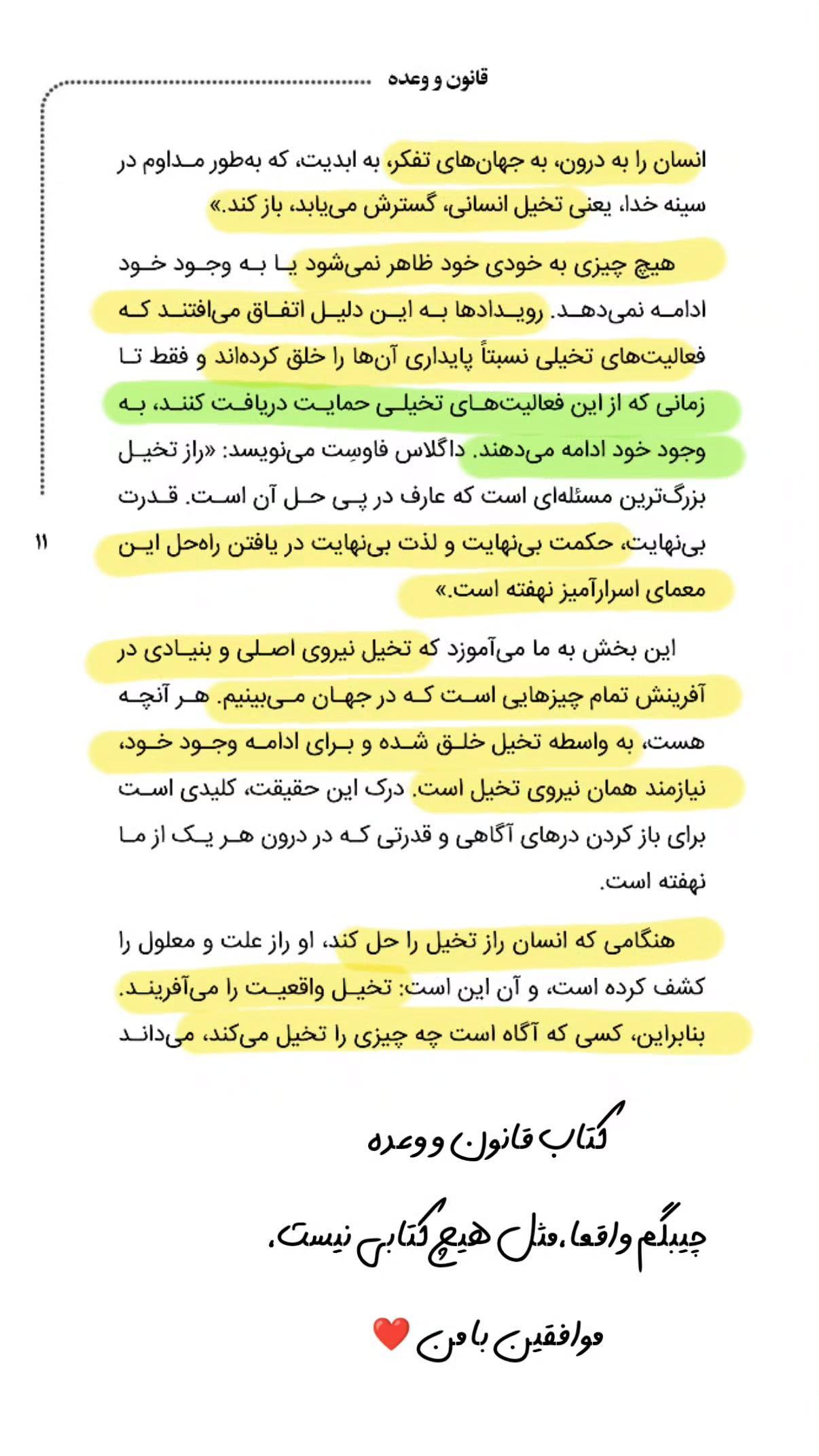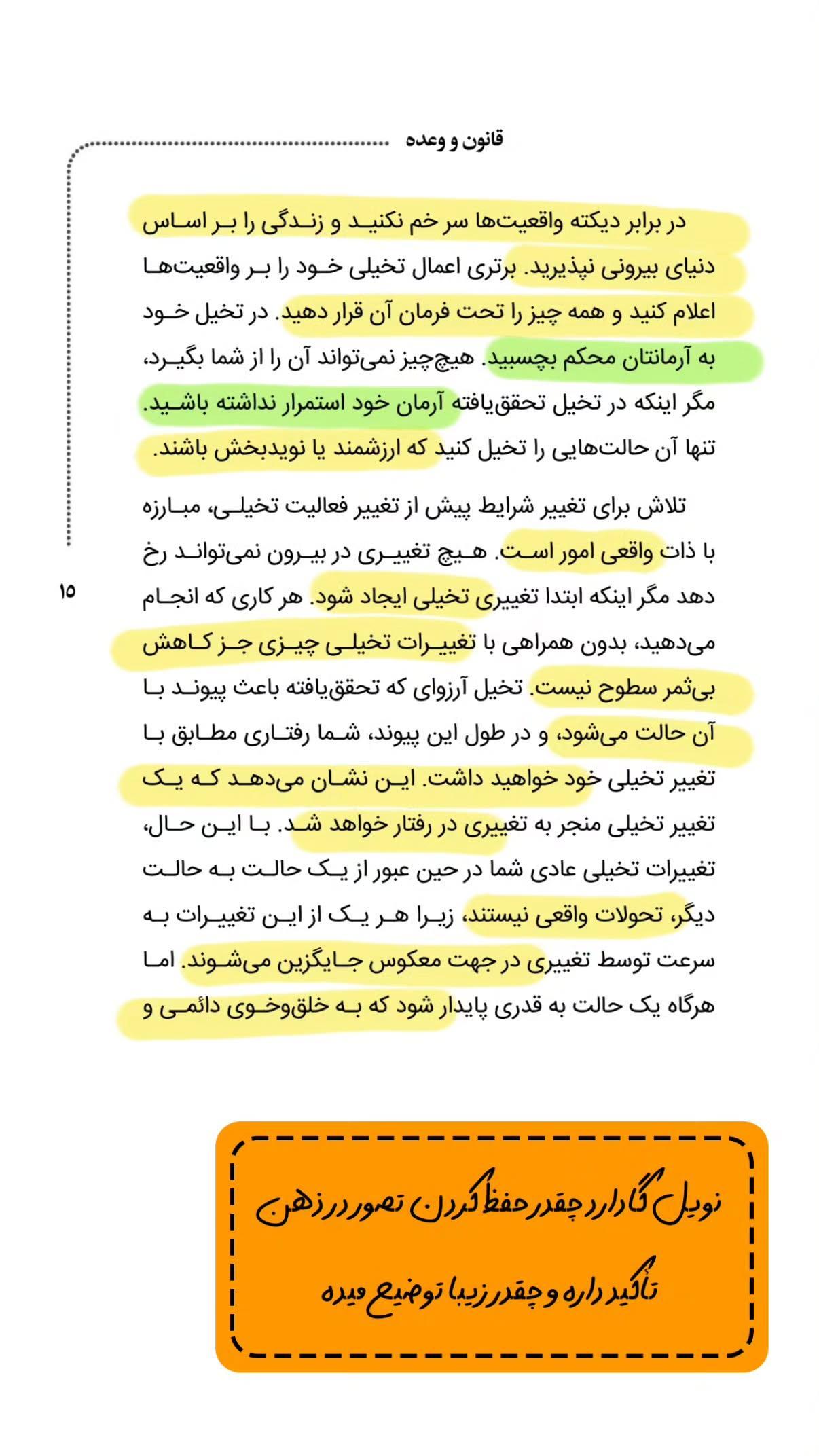 کتاب قانون وعده تازهترین ترجمه از آثار الهامبخش نویل گادارد است که اینبار با برگردان روان فائزه امینیپور و چاپ شیک انتشارات کوانتوم در قطع رقعی و ۲۲۴ صفحه منتشر شده است. گادارد در این اثر، فرمول عملی تبدیل آرزوها به تجربهی عینی را با روایتی داستانی و مثالهای واقعی توضیح میدهد و نشان میدهد چگونه هر فکر، بذرِ رویدادی آینده است. اگر به قانون جذب، تجسم خلاق یا برنامهریزی ذهن ناخودآگاه علاقهمندید، «قانون وعده» میتواند بهعنوان نقشهی راهی روشن، فرآیند خلق خواستهها را برایتان ساده و قابل اجرا کند.